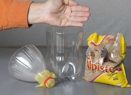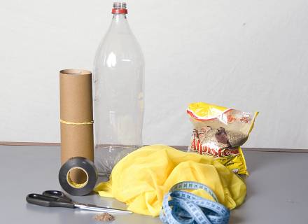 O material necessário: uma garrafa pet de 1,5 ou 2 l, um pedaço (5 x 5 cm) de microtule, quatro grãos de alpiste ou uma pelota de ração de gato, uma tesoura, uma lixa de madeira número 180 e fita isolante preta