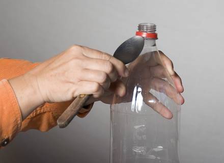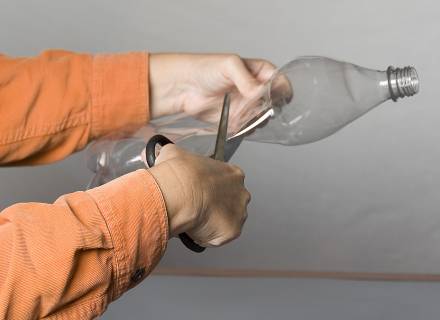 Corte a garrafa em duas partes. Para facilitar a operação, amasse a garrafa até obter uma dobra, onde pode ser aberto um furo. Posicione a tesoura no furo e corte o restante da garrafa