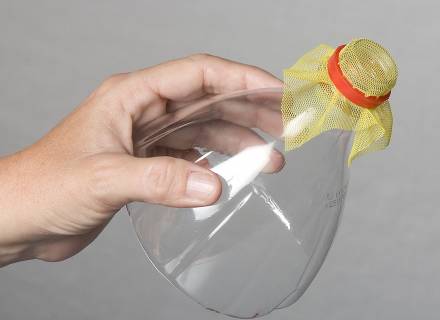 Dobre o pedaço de microtule e cubra a extremidade do funil correspondente à boca da garrafa. Use o anel do lacre como presilha. Certifique-se de que o material cobriu toda a área