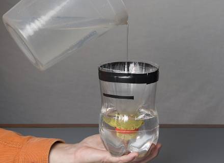 Usando um pedaço da fita, marque no copo a altura ideal do nível da água. Metade do funil deve ficar preenchido com água. Verifique-a diariamente, repondo a água que evapora