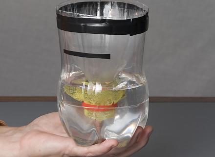Deixa parte da agua acima de uma rede onde o mosquito pode colocar os ovos, estes vão para o fundo ultrapassando uma tela localizada no meio da armadilha, ao virarem larvas ficam maiores que o orificio da rede e não conseguem sair, veja imagens abaixo: